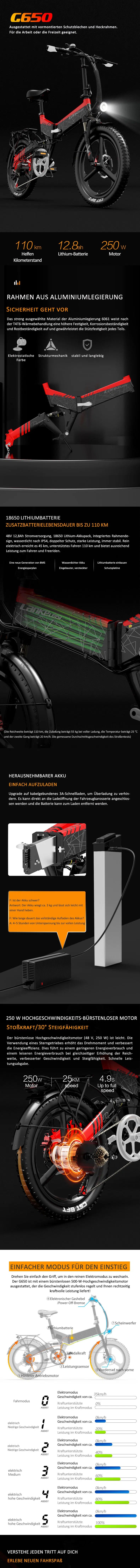 Ausgestattet mit einem herausnehmbaren 48V 12,8Ah Lithium-Akku, der geschickt in den Rahmen integriert ist, bietet das G650 Komfort und elegantes Design. Dank der Wasserdichtigkeit nach IP54 erhalten Sie auch bei leichtem Regen zuverlässige Leistung. Fahren Sie bis zu 45 km rein elektrisch oder bis zu 110 km mit Tretunterstützung – ideal für längere Fahrten in der Stadt.