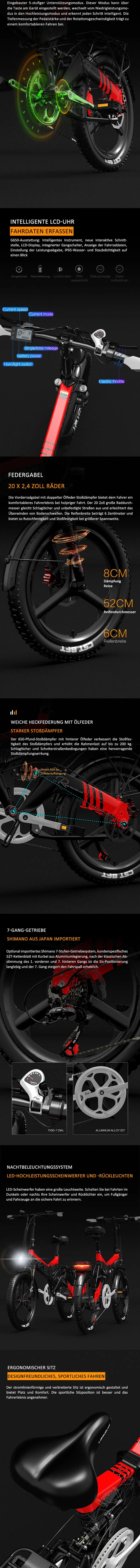 Dieses kompakte E-Bike verfügt über eine Ölfedergabel vorne und einen 650 lb starken Ölfederstoßdämpfer hinten und sorgt so für hervorragende Vibrationsdämpfung und Stabilität. Egal, ob Sie durch Schlaglöcher oder unebenes Gelände fahren, das G650 bietet eine ruhige und komfortable Fahrt.