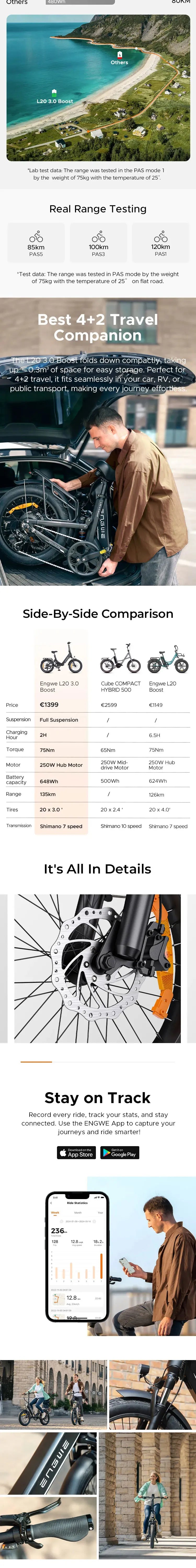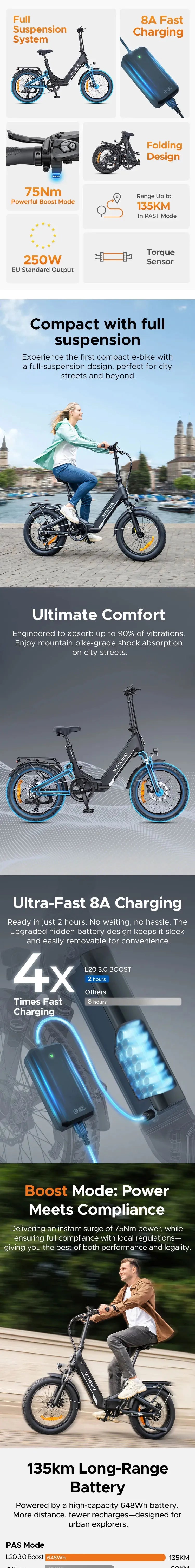 The L20 3.0 Boost is built for comfort and confidence, with front and rear suspension working together with wide 20×3.0 fat tires to smooth out bumps and rough terrain. A powerful front headlight ensures safe night rides, while every detail is crafted to make your journey effortless, stable, and enjoyable—turning every ride into a relaxed adventure.